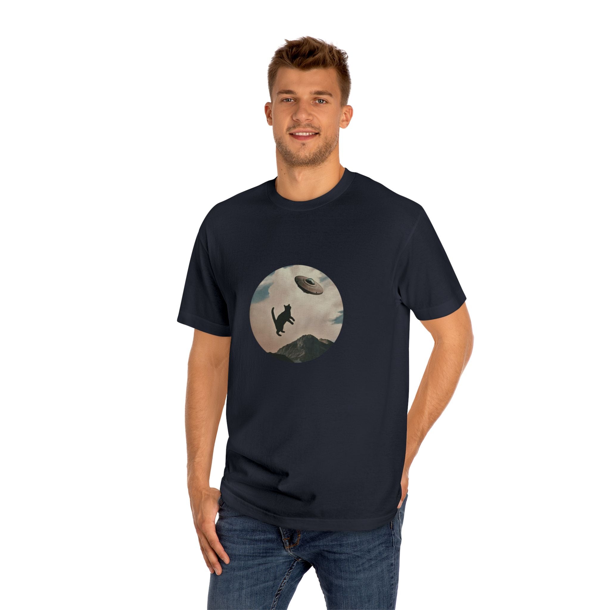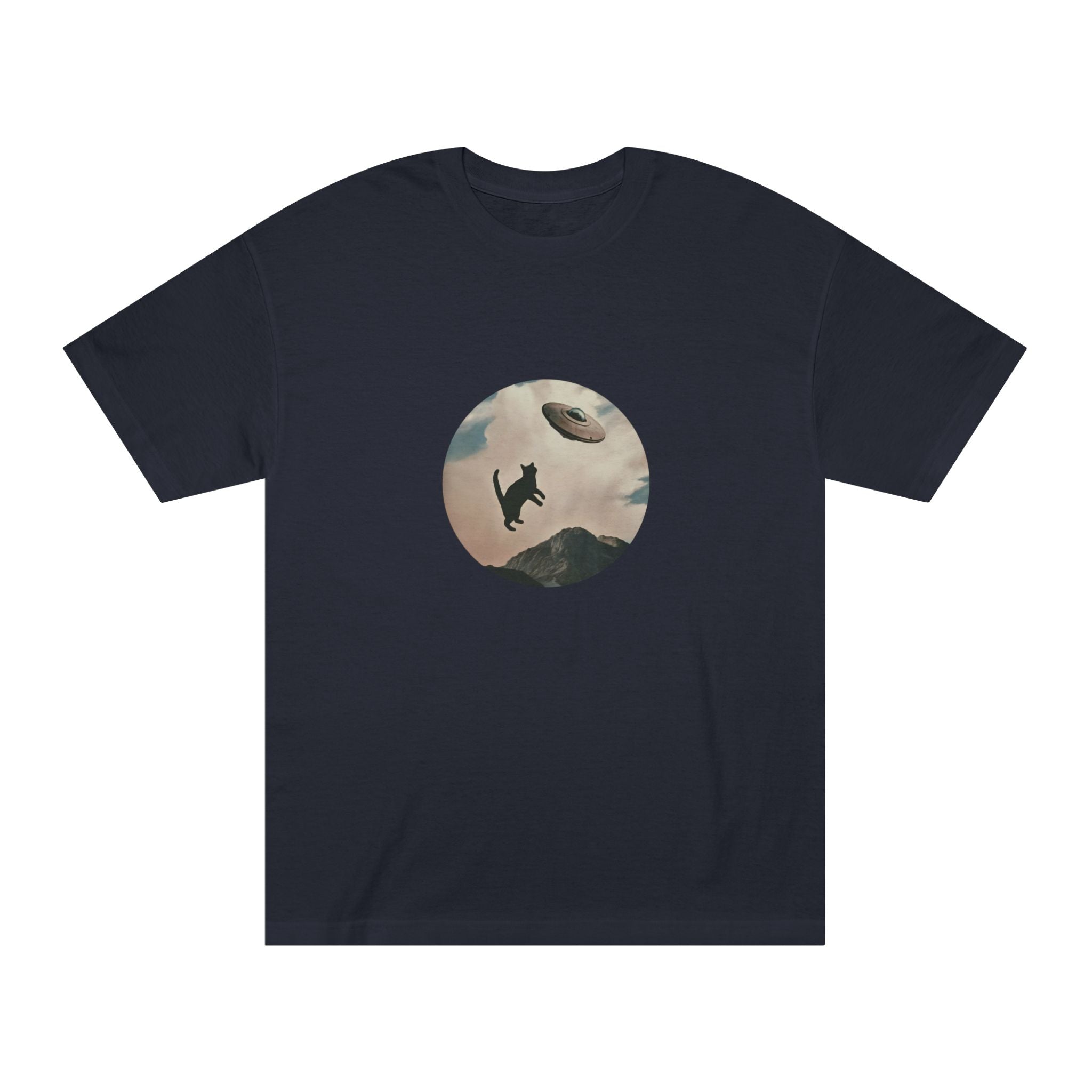 It is not clear if the UFO is abducting the cat or the opposite