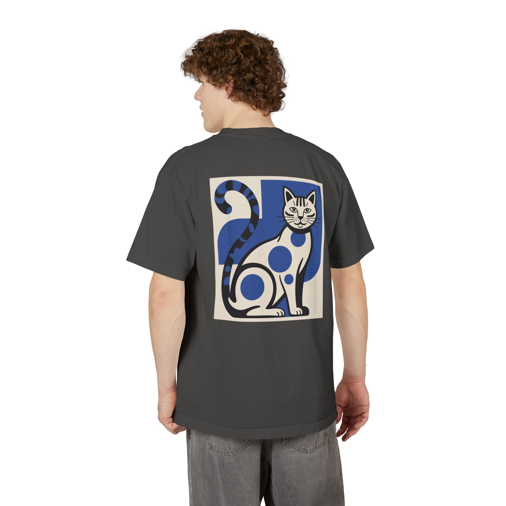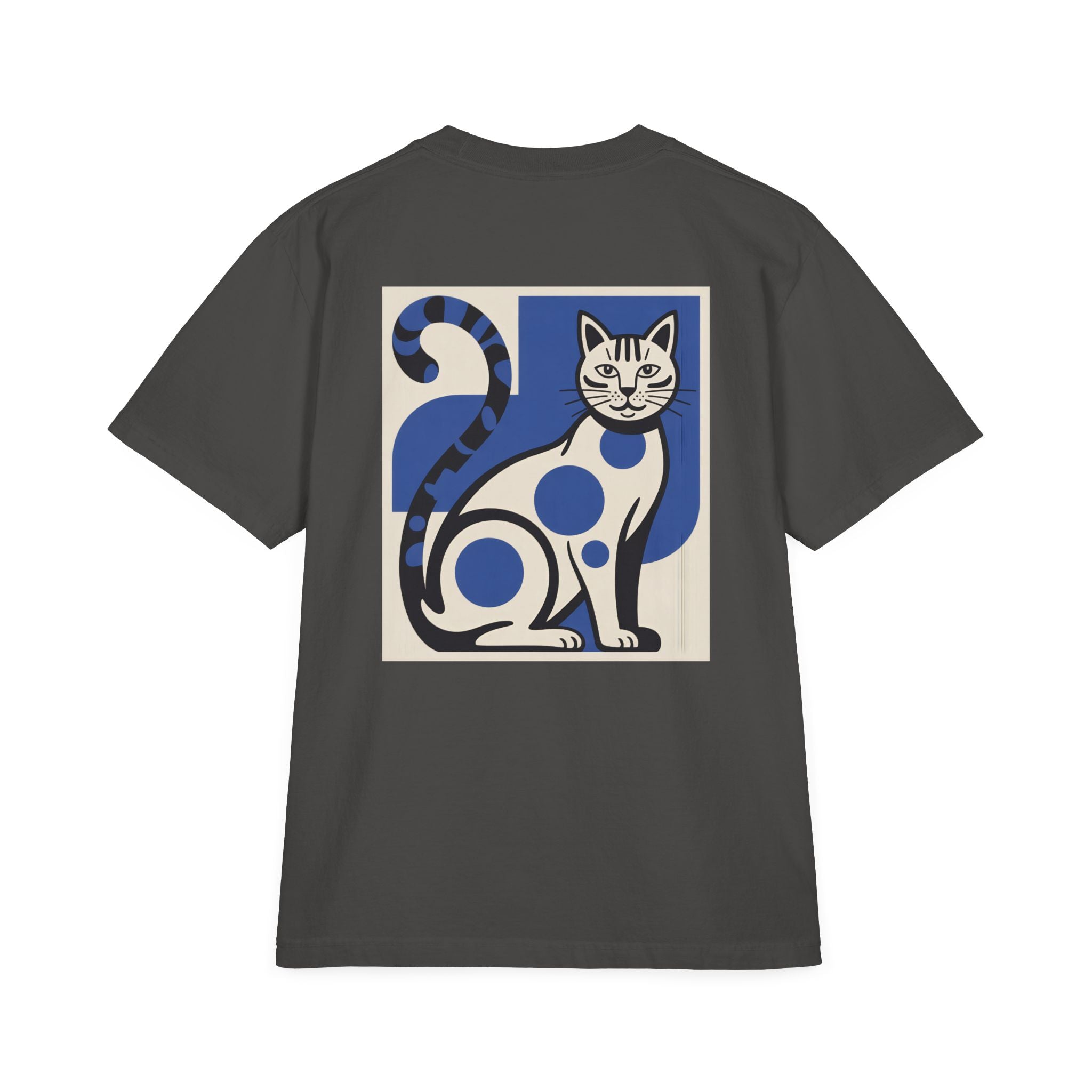 Soft, lived-in cotton with a quiet, artful twist. This garment-dyed tee carries a vintage-washed depth of color and a relaxed drop-shoulder silhouette that drapes like an old favorite. On the back, a graphic cat illustration—bold shapes and calm blues—adds playful contrast without shouting. It feels worn-in from the first wear, sits comfortably at the neck thanks to a forward-placed shoulder seam, and keeps its shape with double-needle stitching. Wear it for slow weekends, gallery hops, or days when you want comfort and subtle personality in one piece.