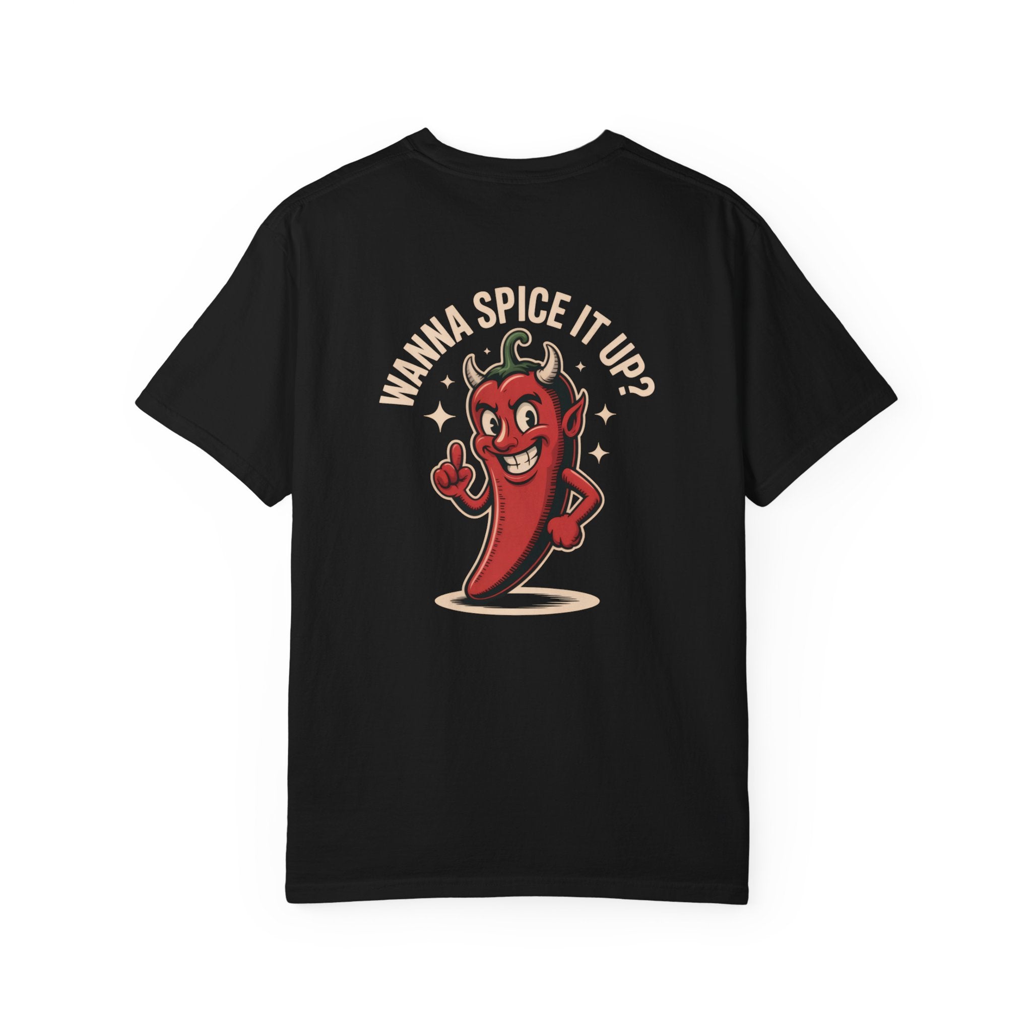 This heavyweight, garment-dyed tee brings a mischievous spark to everyday wear. The design — a cheeky demonic chili pepper asking “Wanna spicy it up?” — reads like a dare: playful, a little wicked, and impossible to ignore. The soft, lived-in hand from the after-dye process makes the shirt feel like an old favorite from the first wear, while the relaxed fit and durable double-needle stitching stand up to regular use. Wear it to backyard cookouts, late-night taco runs, music shows, or whenever you want to add a little heat and humor to your look. It pairs naturally with worn denim, layered under an open flannel, or shown off solo when you want the graphic to do the talking.