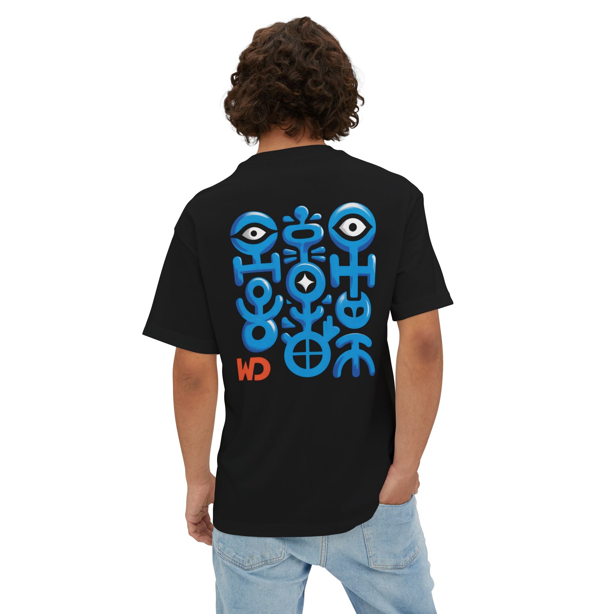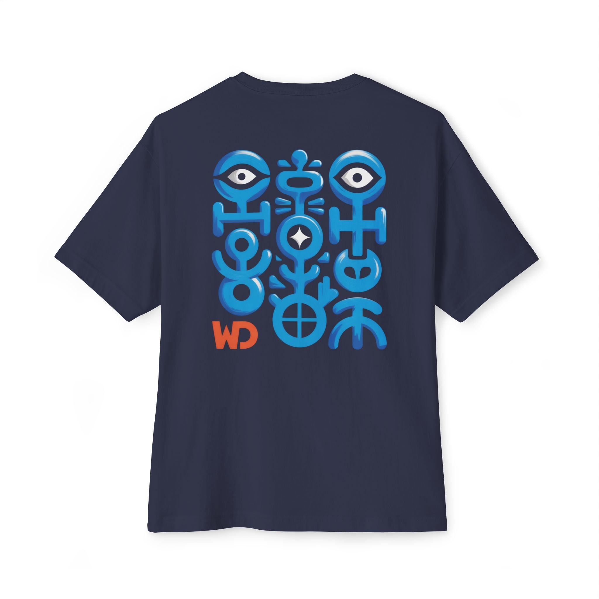 This oversized boxy tee feels like a quiet statement. The relaxed drop-shoulder silhouette hangs loose and breathes easy, letting the bold, abstract blue glyph art speak for itself across the back. Wear it with worn jeans or layered under a flannel for an off-duty, creative look that’s equal parts comfortable and expressive. The medium-weight, combed cotton has a soft hand and structure — it moves with you, not against you. It’s the kind of shirt you reach for when you want to feel grounded and a little mysterious at the same time.